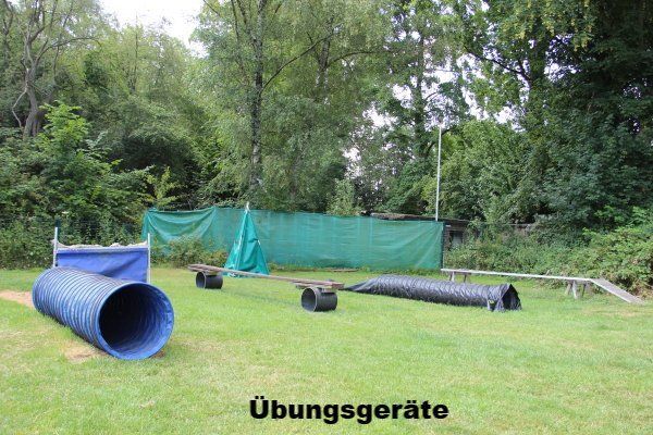 Der  eingezäunte Trainingsplatz spendet auch im Sommer durch unseren Baumbestand ausreichend Schatten. Unser umfangreicher Gerätepark ermöglicht es den Hunden neben verschiedenen Untergründen, Geschicklichkeit, Gewandtheit und Gleichgewichtssinn zu erlernen.